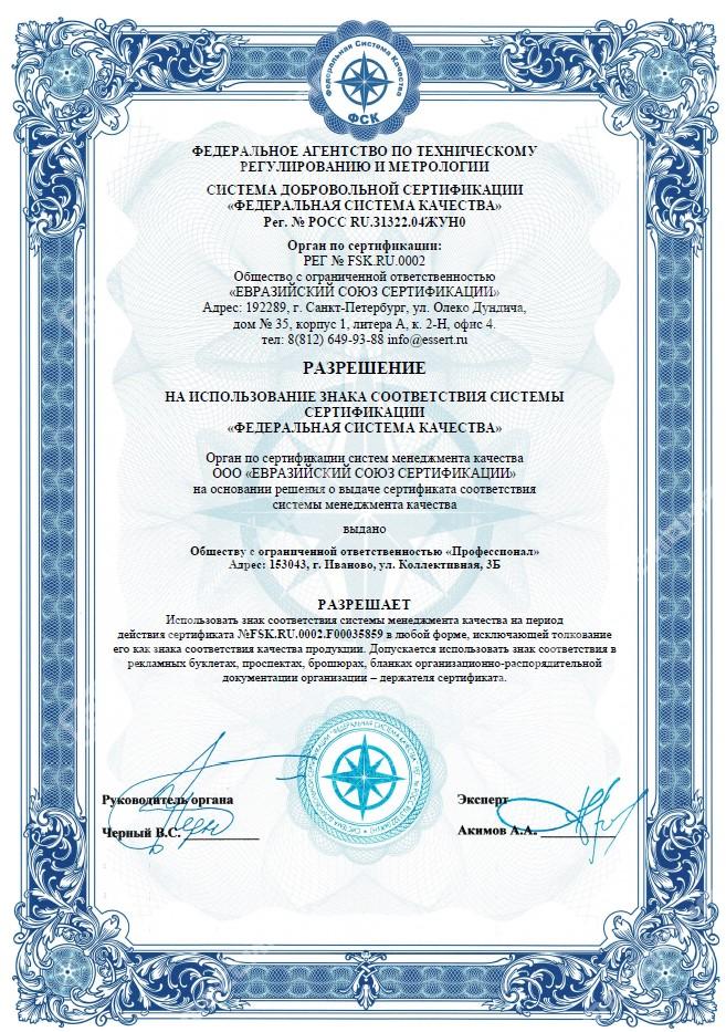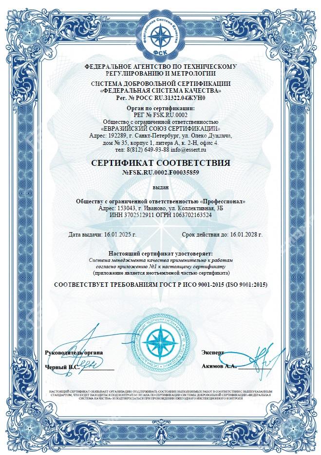 Высшее руководство «Профессионал» берет на себя ответственность за реализацию Политики в области качества, а также за соответствие системы менеджмента качества требованиям международного стандарта ISO 9001:2011 и постоянное повышение ее результативности.